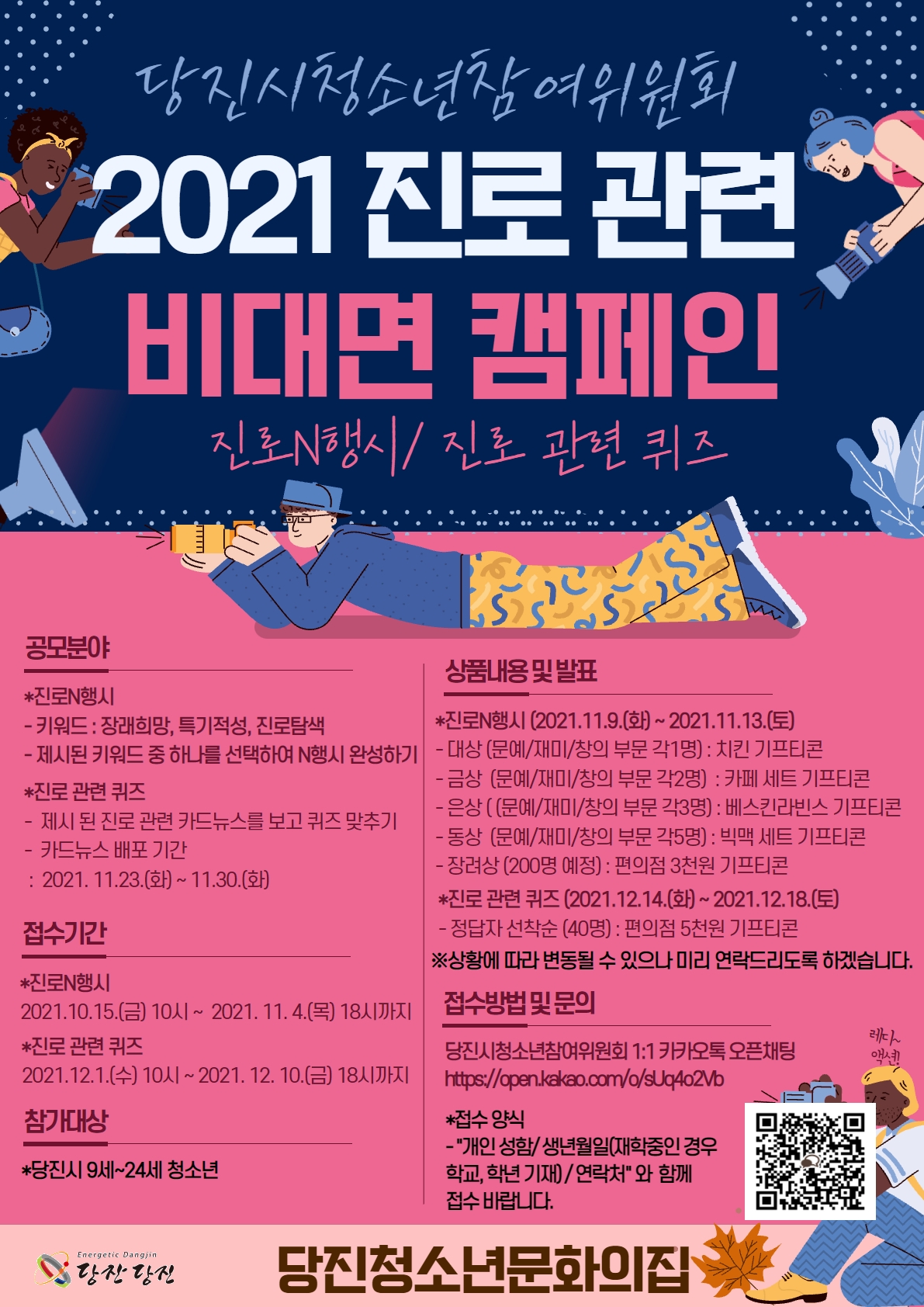 이번 비대면 캠페인은 진로N행시, 진로 관련 퀴즈 등이 마련됐으며 참가대상은 당진시 관내 9세~24세 청소년으로, 신청방법은 ‘당진시청소년참여위원회 1:1 카카오톡 오픈채팅(https://open.kakao.com/o/sUq4o2Vb)’으로 접수양식에 맞춰 전송하면 된다.