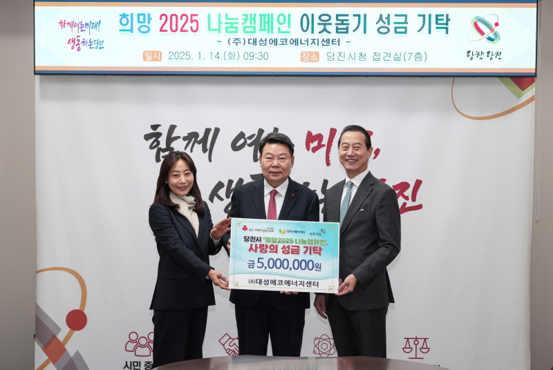 이에 오성환 당진시장은 “지역사회를 위해 나눔을 실천해 주신 ㈜대성에코에너지센터에 진심으로 감사드린다. 성금은 꼭 필요한 곳에 소중히 사용하여 더불어 사는 따뜻한 지역사회를 만드는 데 힘쓰겠다”라고 하며 감사의 뜻을 전했다.