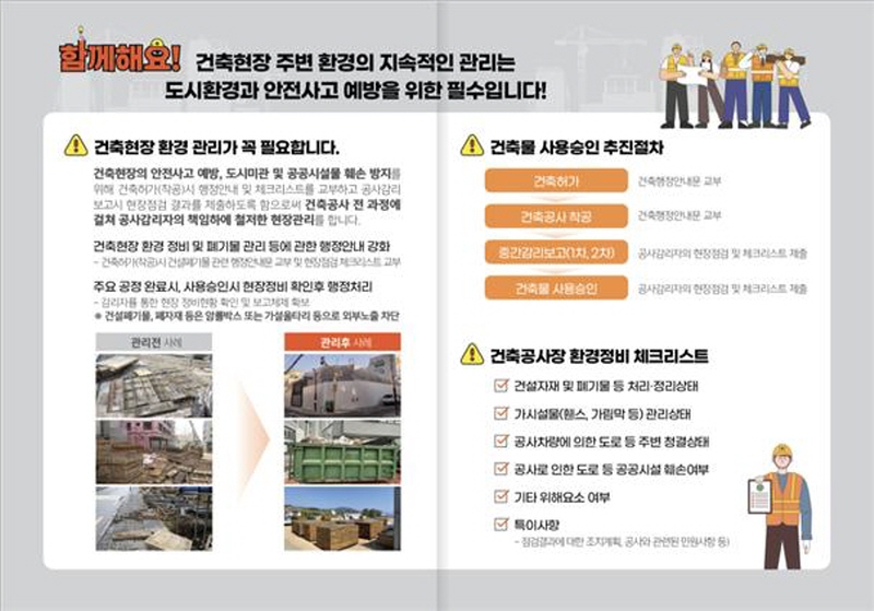 또한, 올해부터는 ‘건축공사장 환경관리 표준 체크리스트’를 제작・배포해 공사 착수 후 주요 공정 완료시마다 현장 점검이 이루어지도록 관리 체계를 한층 강화했다.