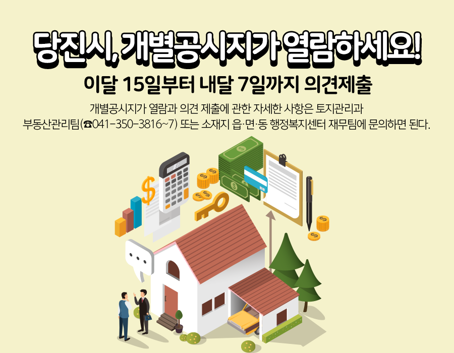 토지 지번별 ㎡당 가격으로 산정한 개별공시지가에 대해 의견이 있는 경우 토지소유자 또는 이해관계인은 토지소재지의 읍‧면‧동 행정복지센터와 당진시청 토지관리과 부동산관리팀으로 열람기간 동안 의견을 제출할 수 있다.