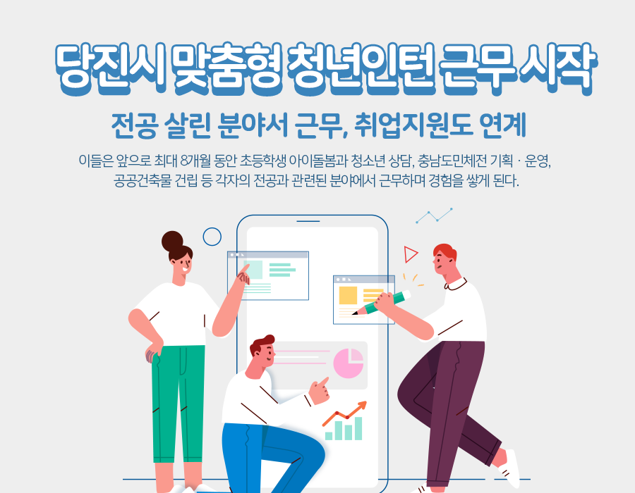당진시 맞춤형 청년인턴 사업은 미취업 청년들을 대상으로 전공 등을 고려한 근무기회를 제공함으로써 청년들의 구직 단념을 예방하고 취업 경쟁력을 강화해 민간 일자리로의 취업을 촉진하기 위한 시책 사업이다.