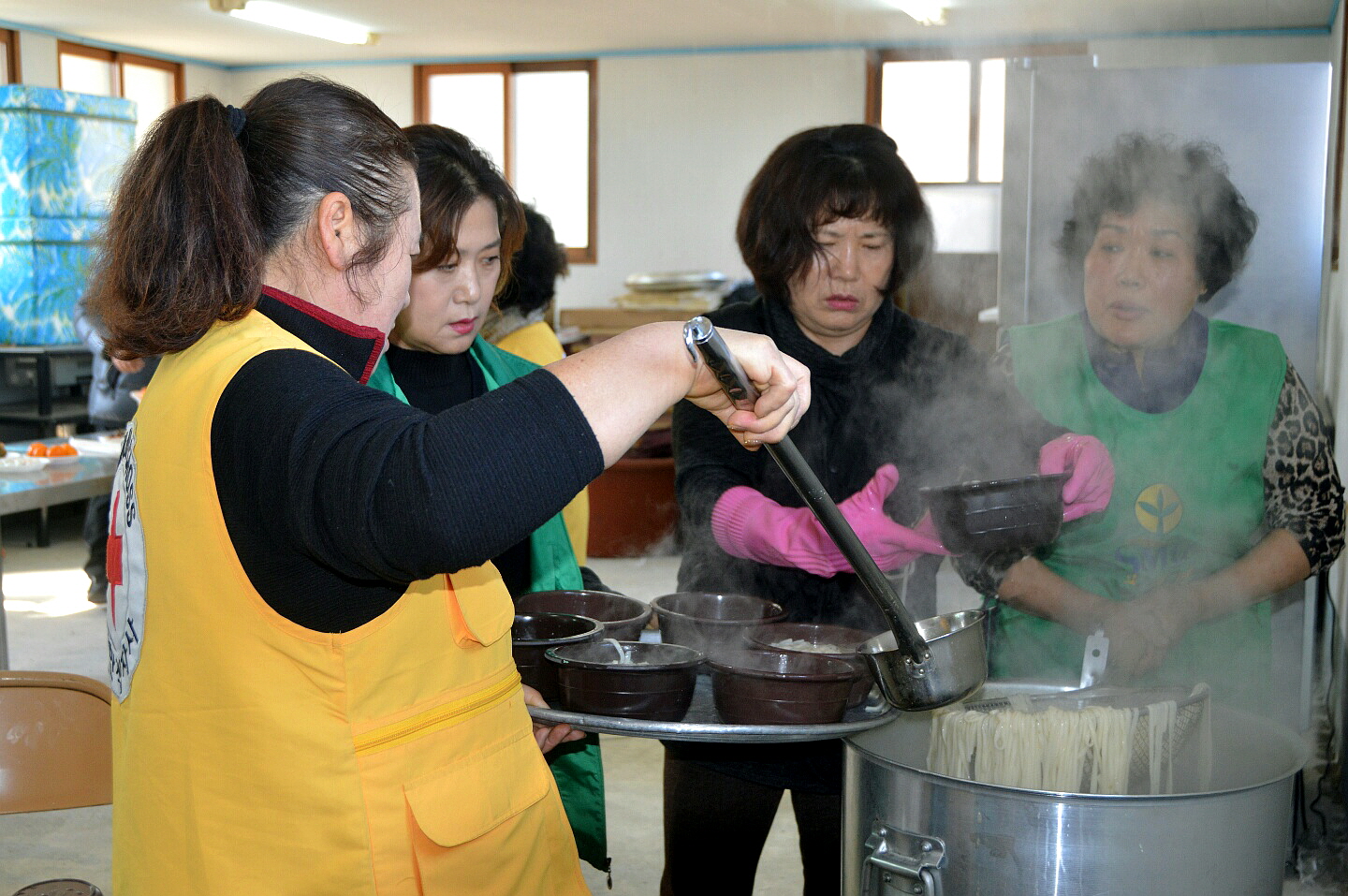 ▢ 대한적십자봉사회 당진지구협의회 고대면봉사회(회장 강미남)가 지역 어르신들에게 칼국수 나눔 봉사활동을 전개하고 있음.