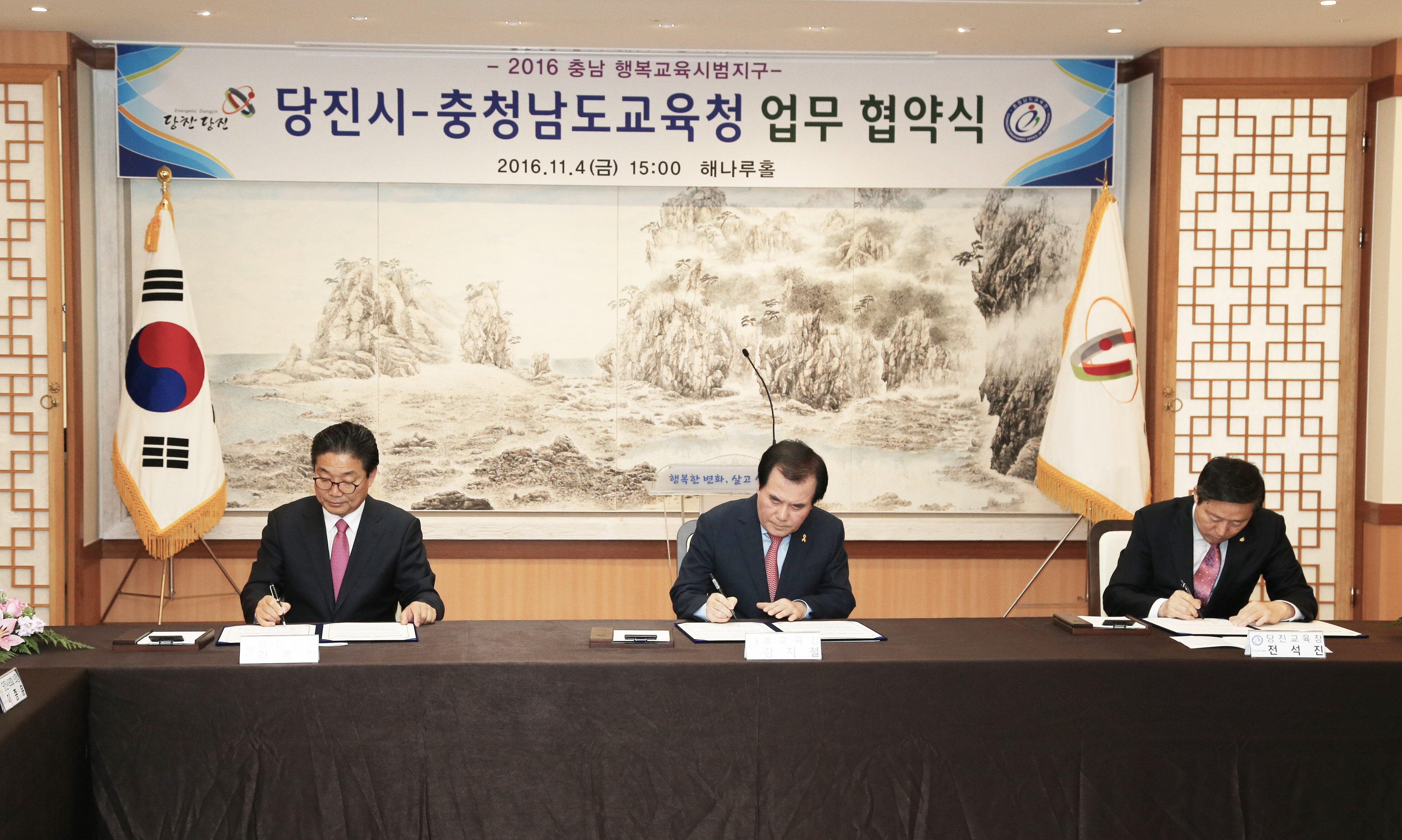 시는 본격적인 사업추진에 앞서 지난 4일 당진시청 해나루홀에서 김홍장 시장과 김지철 충남도교육감이 참석한 가운데 ‘충남 행복교육시범지구 업무협약’을 체결했다.