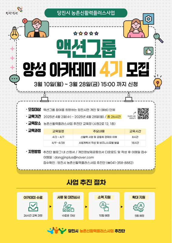 당진시 농촌신활력플러스사업 추진단(추진단장 김건준)은 지역 주민들의 공동체 경제 활성화와 농촌 지역 발전을 위해 액션그룹 양성 아카데미 4기 교육생을 모집한다고 13일 밝혔다.