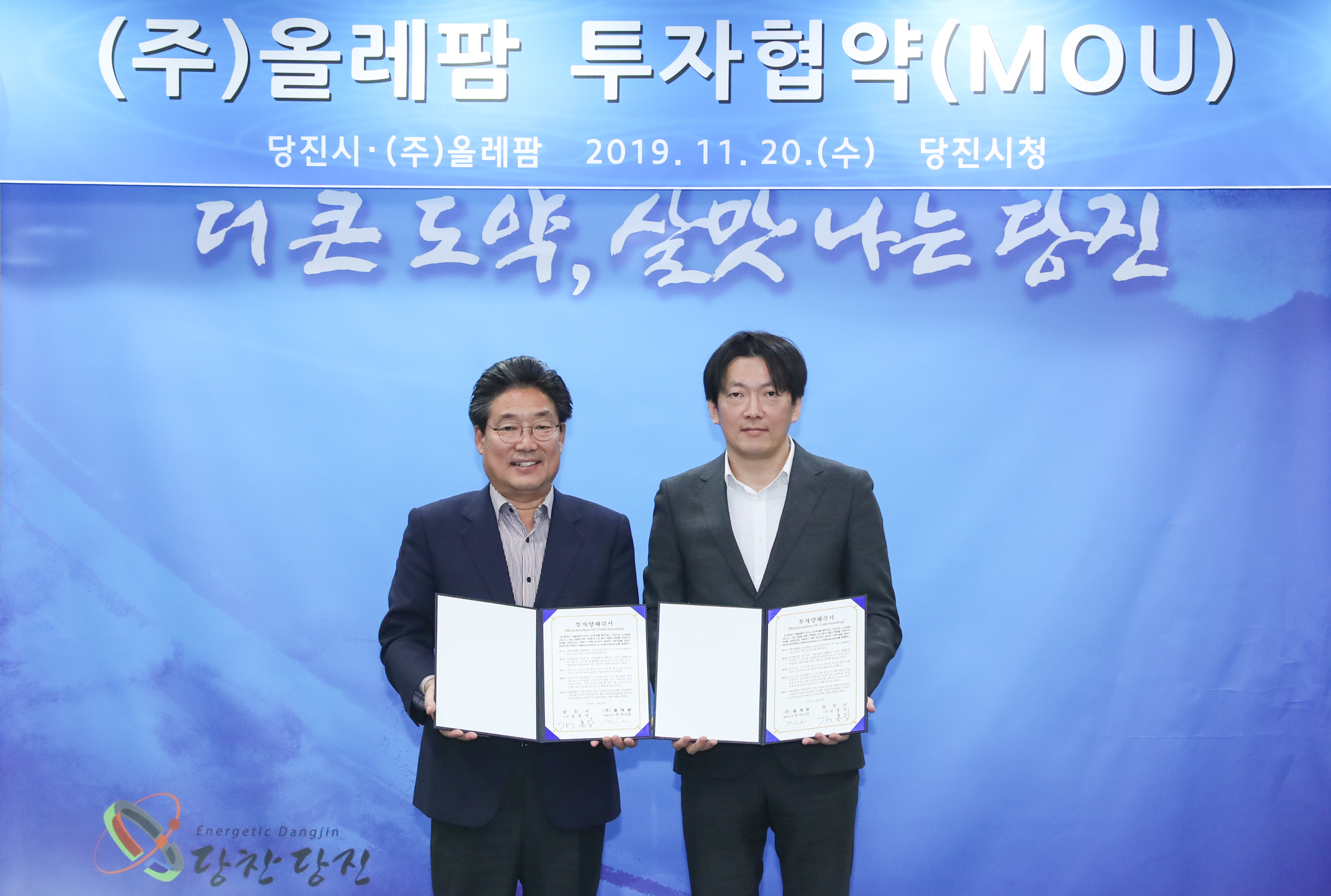 당진시에 따르면 20일 당진시청 해나루홀에서 김홍장 시장과 ㈜올레팜 마이클 안 대표이사 등 관계자들이 참석한 가운데 공장설립과 생산단지 조성을 위한 투자의향 협약을 맺었다.