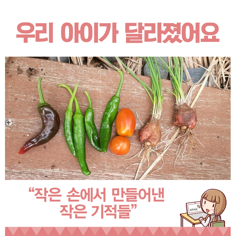 그동안 코로나19로 실외활동에 제약이 많아 부모님들이 양육 스트레스가 많았는데요. 아이들이 텃밭과 연계된 다양한 활동을 하면서' 우리 아이가 달라졌어요'라는 기분 좋은 후문이 들려옵니다.