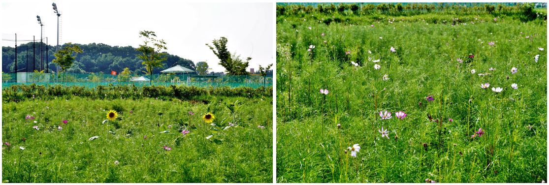 8월 현재는 넓게 형성된 코스코스 군락 중간중간 해바라기와 코스모스가 피어났습니다.