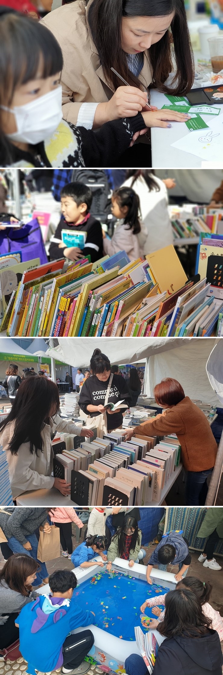 소통마당에는 독서 관련 단체에서 운영해 주었는데요. 책 속 캐릭터를 이용해 손이나 얼굴에 그림을 그리기도 하고, 그림책을 만들어 보기도 합니다. 한쪽에서는 좋은 책 나눔 장터가 마련되어 책 고르는 재미에 빠져 보기도 합니다.