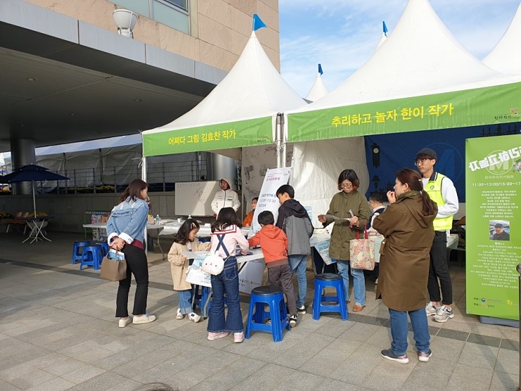 다소 쌀쌀해진 가을 날씨임에도 불구하고 많은 시민들이 모였습니다. 프로그램 확인을 위해 행사 안내지를 먼저 받아 봅니다. 이번 행사는 책과 관련된 다양한 행사와 공연이 있는 참여마당, 체험부스와 작가들과의 만남이 진행되는 소통마당, 출판사들을 만나볼 수 있는 성장 마당으로 구성되어 있는데요. 먼저, 소통마당에 참여해 보았습니다.
