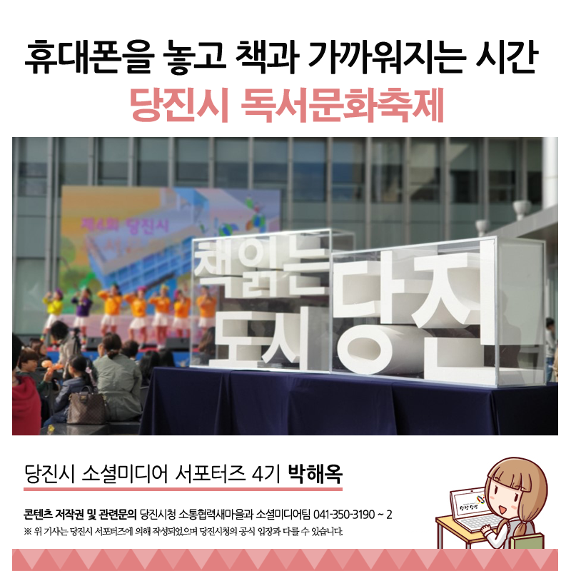 평소에는 책보다 휴대폰을 갖고 있는 시간이 더 많지만, 이날 하루만큼은 종이책의 바스락거림을 느끼고, 상상을 통해 다양한 이야기를 만들어 내는 책으로 꿈꾸는 하루였습니다. 이번 행사를 통해 책으로 더욱 풍성한 당진시가 되었기를 바라봅니다.