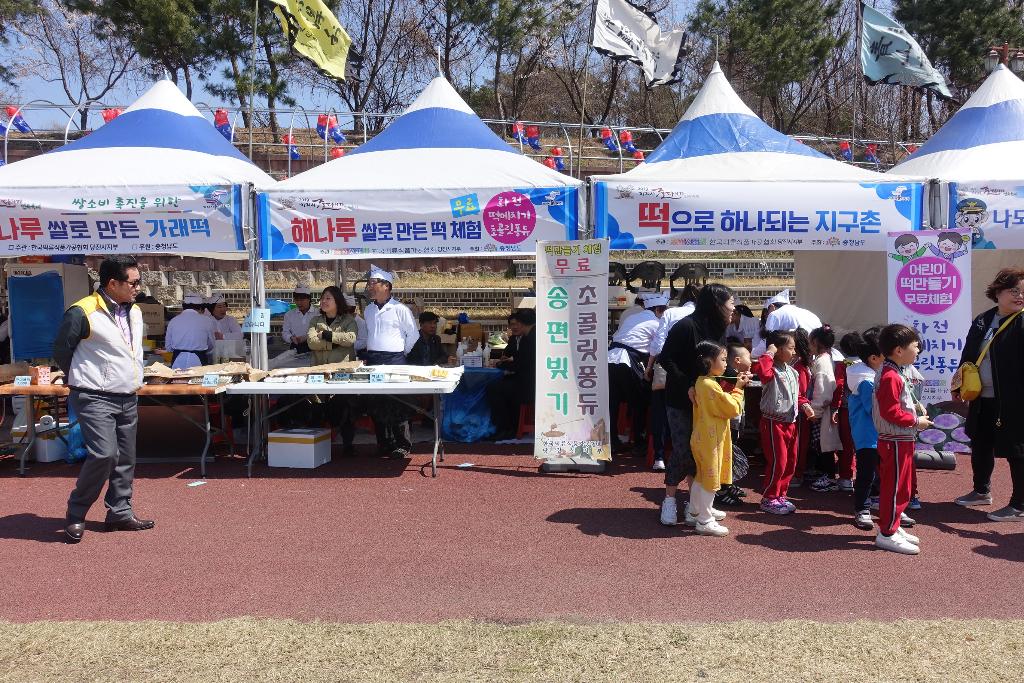 해나루쌀로 만든 떡 체험, 떡으로 하나 되는 지구촌, 해나루 쌀로 만든 가래떡 등 당진 해나루쌀을 홍보하고 있습니다.