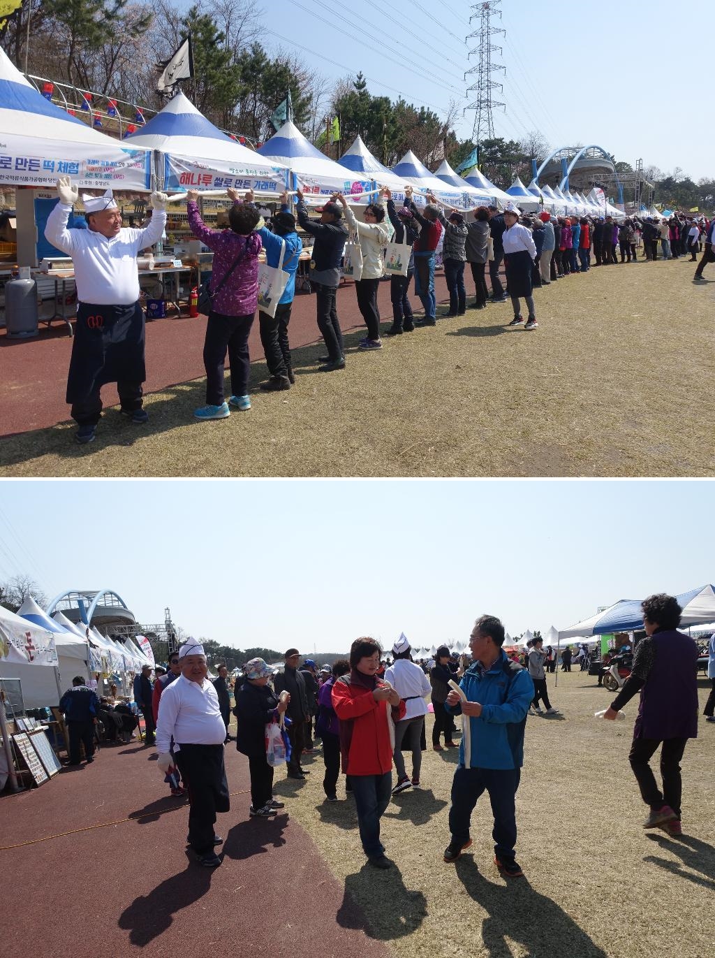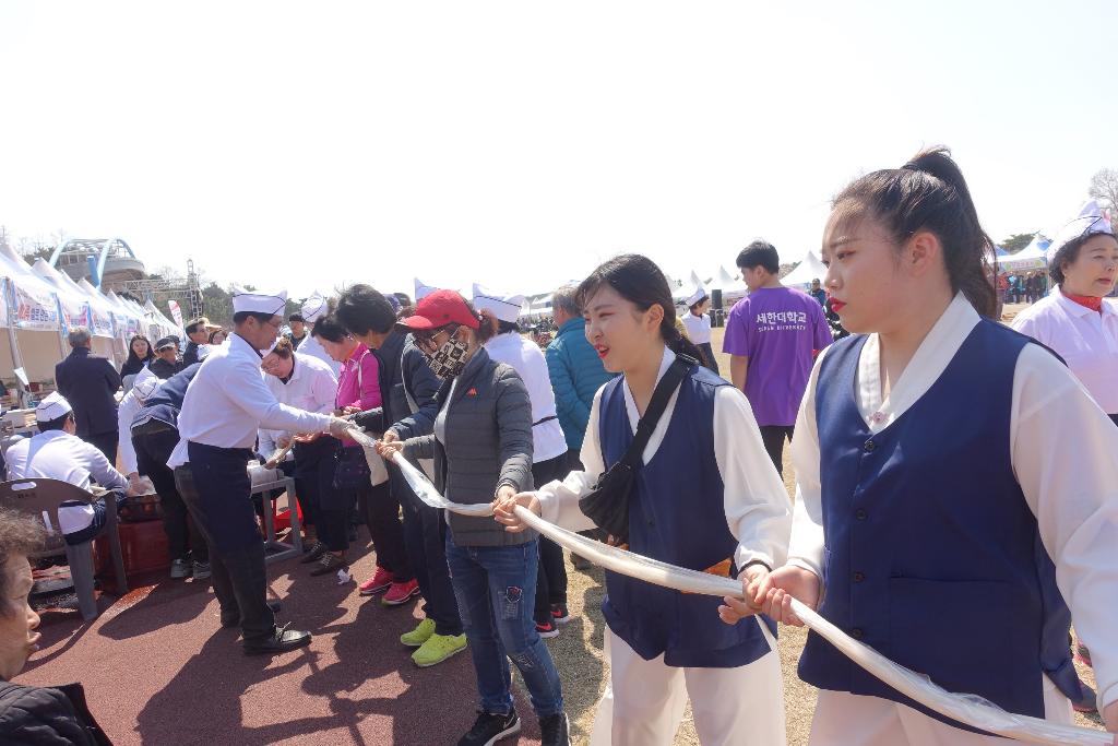 관람객들과 줄다리기를 하고 이벤트성 가래떡 길게 뽑기를 했습니다. 관람객들이 가래떡을 잡아당기면서 행사장을 광장을 한 바퀴 쭉 둘러섰습니다. 강강술래 하듯 가래떡을 들고서 둥글게 원을 그려 섰습니다.