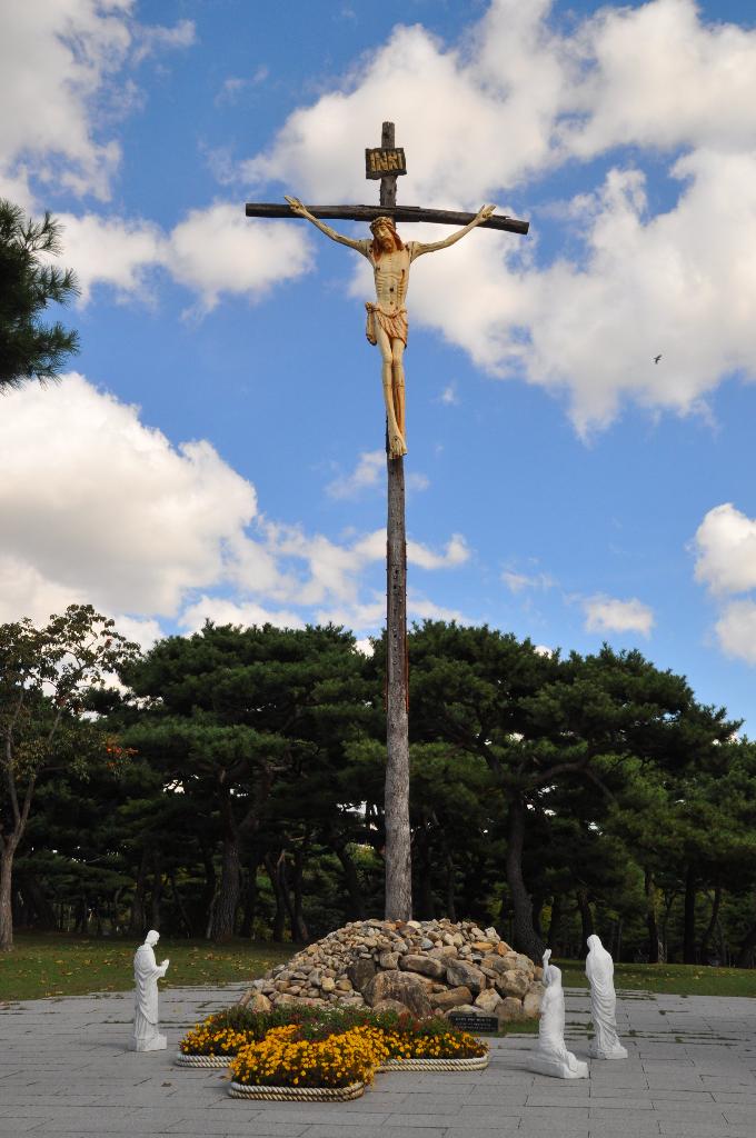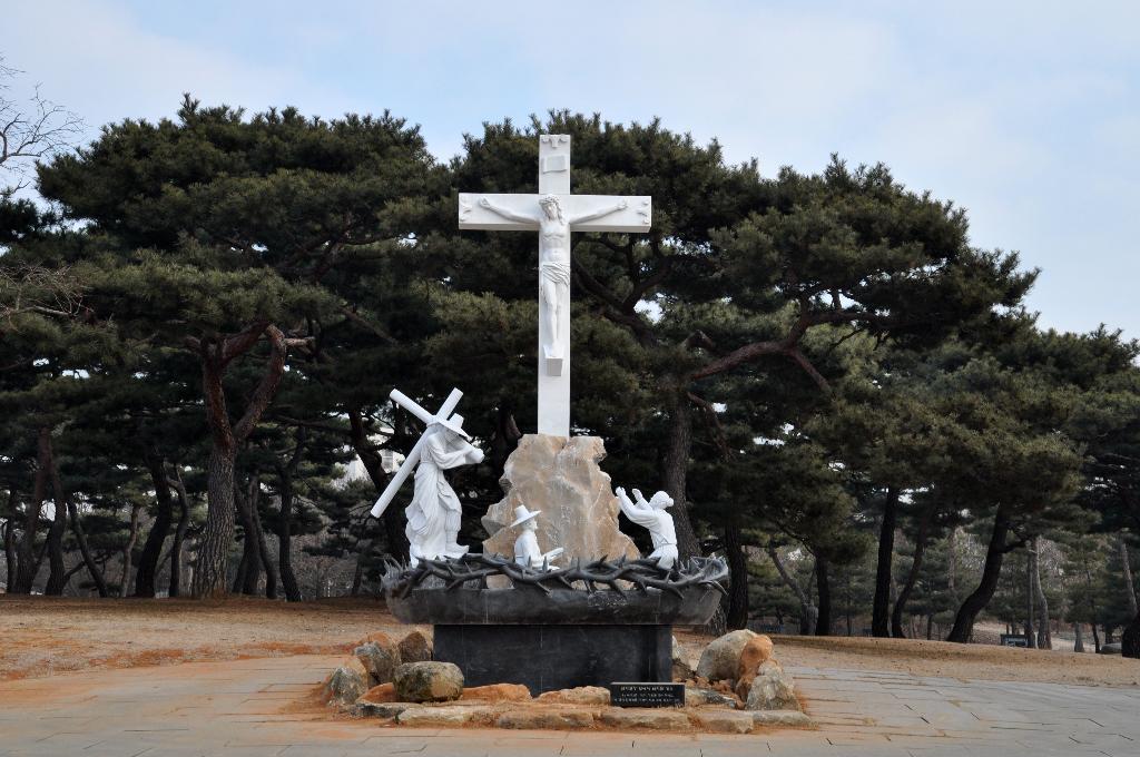예전과 변한 모습이 보이는데요, 전에는 소나무숲 으로 가기 전에 나무십자가에 못 박힌 예수님의 모습이 있었는데 이번에 가 보니 십자가의 길을 이끌어주는 조형물로 바뀌어 있었습니다. 십자가의 길에는 예수님이 사형을 언도 받은 후부터 부활하신 모습까지 조형물로 만들어 놓아 천주교신자들의 순례지가 되고 있습니다.