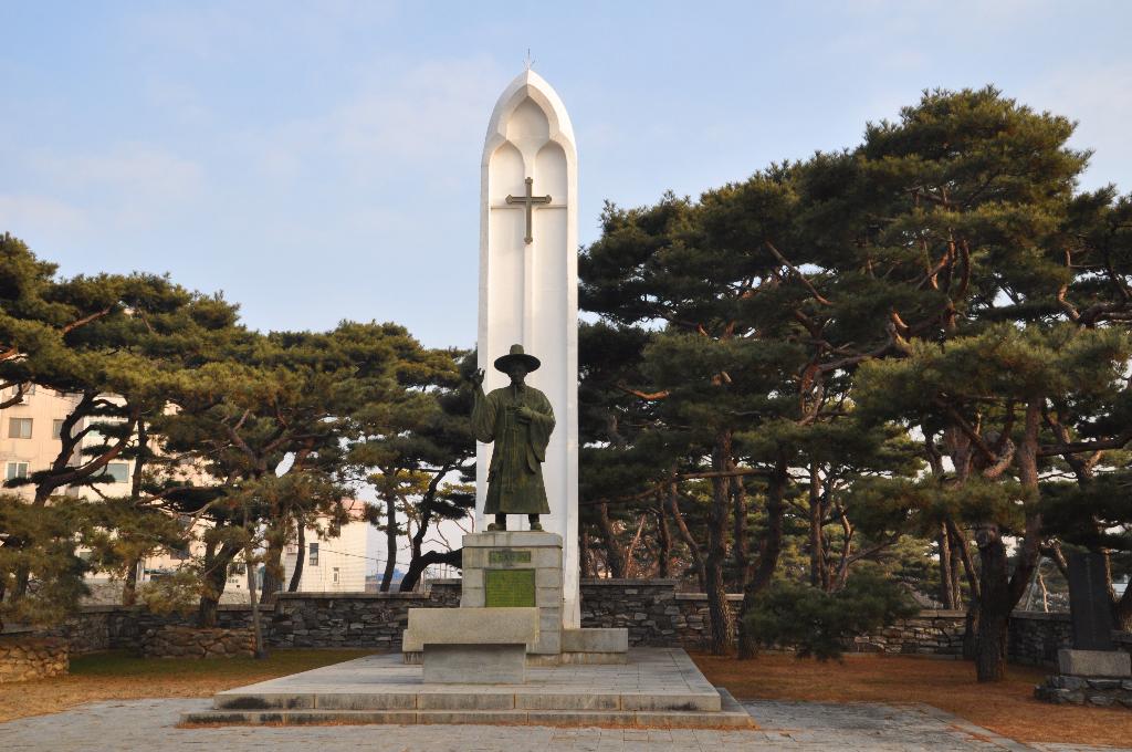 기념관 앞에는 성당이 있는데 이날도 순례자들이 기도를 드리고 있었습니다. 성지에 세워진 십자가를 보면 종교와 상관없이 숙연해집니다. 성지의 입구에 들어서면 왼쪽에 김대건 신부가 나고 자란 생가 터에 다다릅니다. 단아한 모습의 한옥과 함께 그의 상이 마련된 생가터는 그의 증조부 김진후, 조부 김한현, 부친 김제준, 그리고 자신까지 4대가 살았던 곳으로 4대가 순교한 이야기가 전해지는 곳입니다.