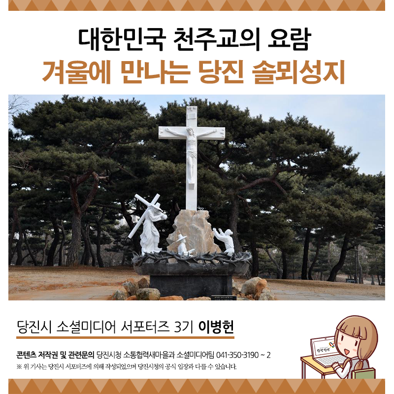 당진의 솔뫼성지는 겨울에 방문해도 참 좋은 곳입니다. 가을에는 코스모스가 아름답게 피어나고 봄에는 유채꽃이 피어나 이곳을 찾는 사람들에게 즐거움을 주고 가을에는 솔뫼성지 소나무 숲에서 솔향기를 만날 수 있으니 더욱 좋습니다.