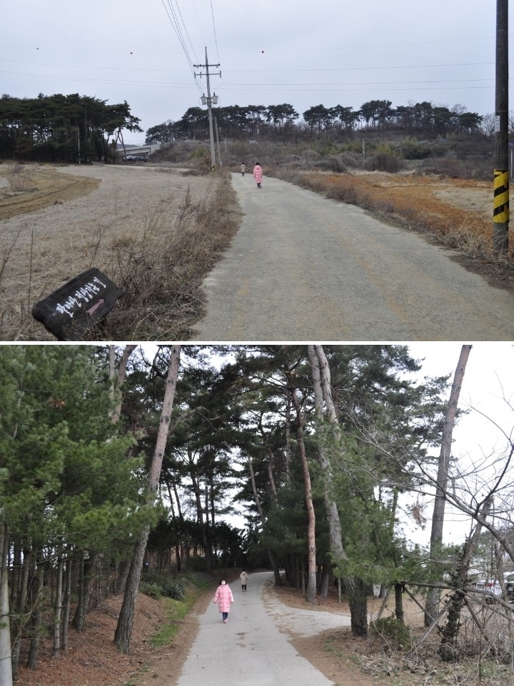 시골길을 따라 걷다 보니 자연어린이집 이정표와 송악 중학교 앞 정류장에 송암공원 이정표가 나옵니다.