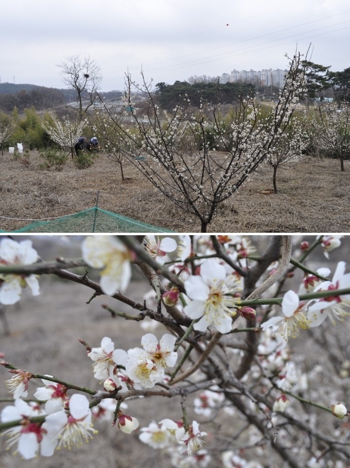 등산로 옆 매실 밭에는 봄을 알리는 매화꽃이 활짝 피어있네요.
