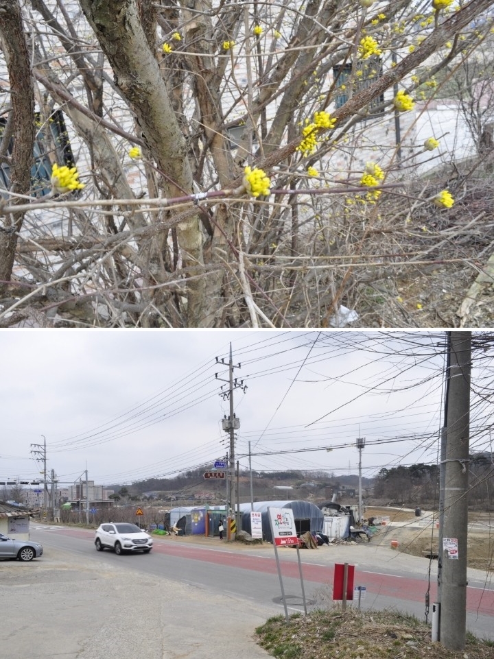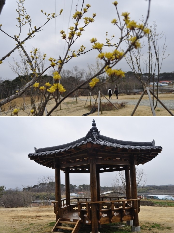 잔디광장에는 잠시 쉬어 갈수 있는 예쁜 정자도 있네요. 정자 맞은편에는 노란 햇병아리처럼 산수유꽃이 망실망실 몽우리를 터트리고 있습니다.