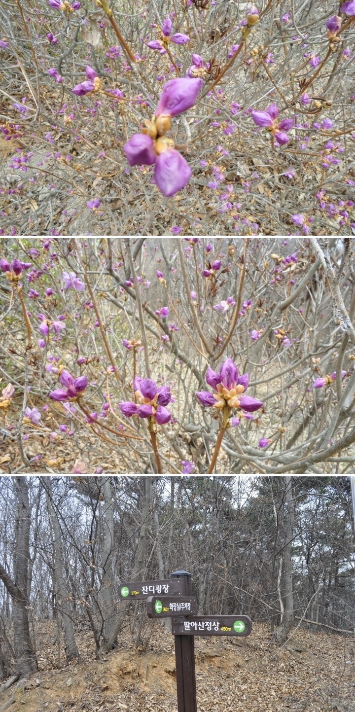 팔아산 정상에서 내려오다 보니 올라갈 땐 보지 못한 진달래가 보입니다. 화장실 주차장 방면으로 향하면 송암공원이 나옵니다.