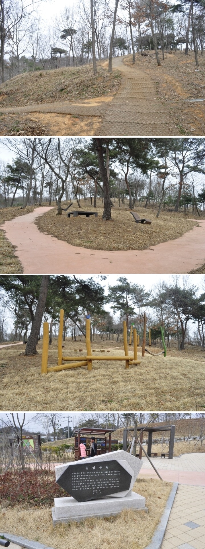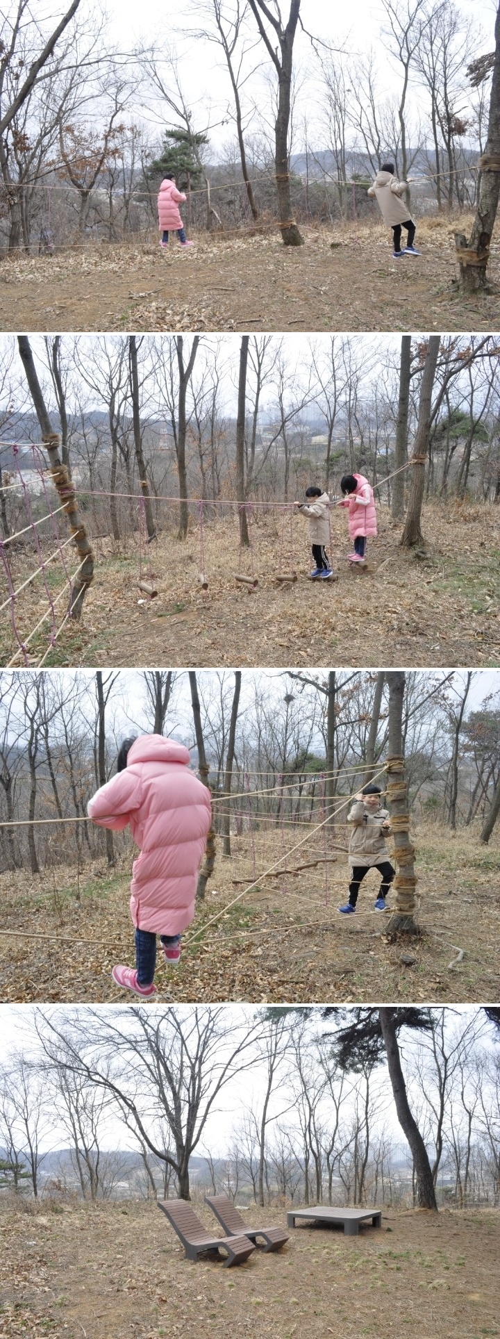 아이들과 함께 송암공원에 들어서니 숲 놀이터가 조성되어 있네요. 숲 놀이터에 밧줄 놀이를 즐길 수 있어 나무 타기와 매달리기를 좋아하는 울 아이들을 위한 안성맞춤 공간이네요. 밧줄 놀이는 호기심이 많고 모험을 좋아하는 아이들과 청소년들이 특히 좋아하는 놀이랍니다.