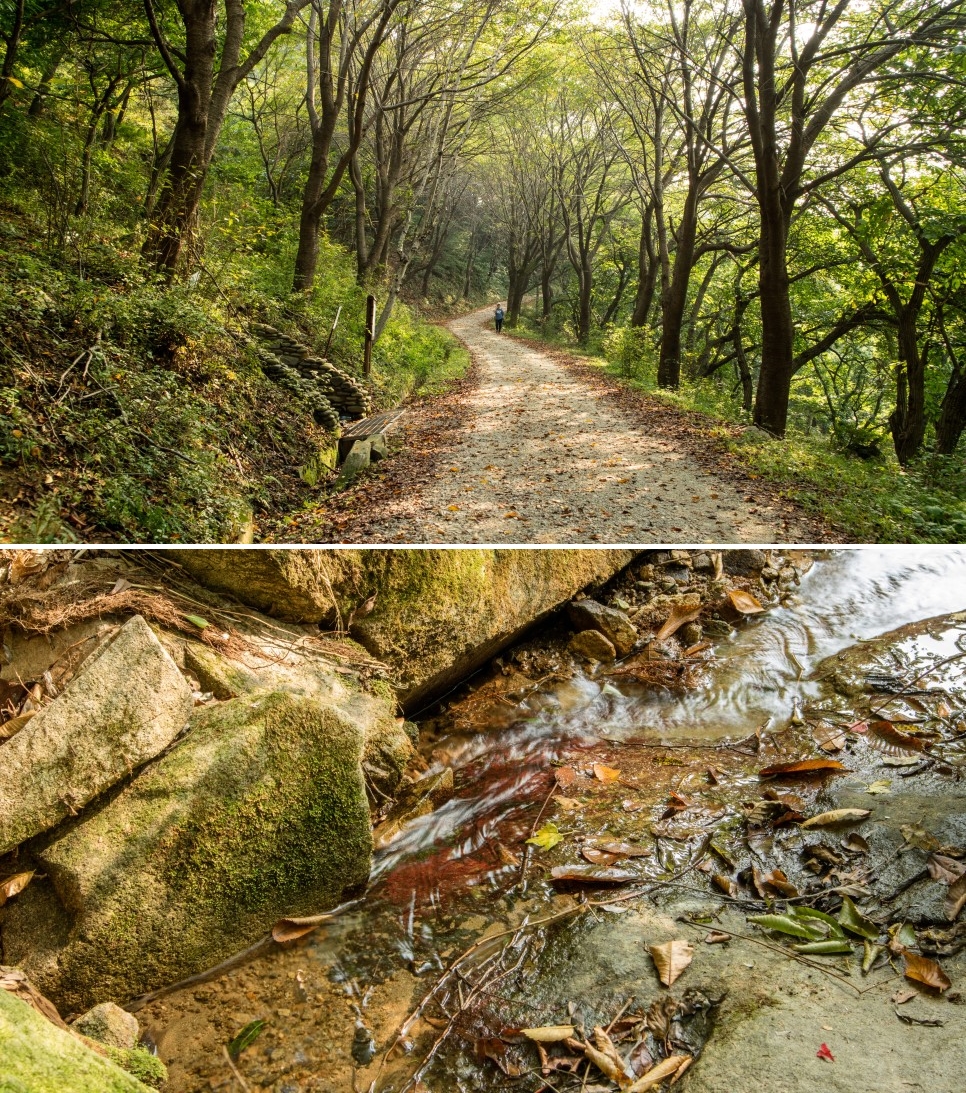 등산로 초입에 아스라이 물소리가 들려 산책길을 잠시 벗어나 비탈길을 내려오니 졸졸졸졸 흐르는 물을 볼 수 있었어요. 그러나 가을 모기가 얼마나 많은지 다시 도망쳐야 했지요. 아직은 조금 더운 날씨이지만, 아미산을 찾는 분이시라면 긴팔 티셔츠를 입으시는 게 좋을 것 같아요.